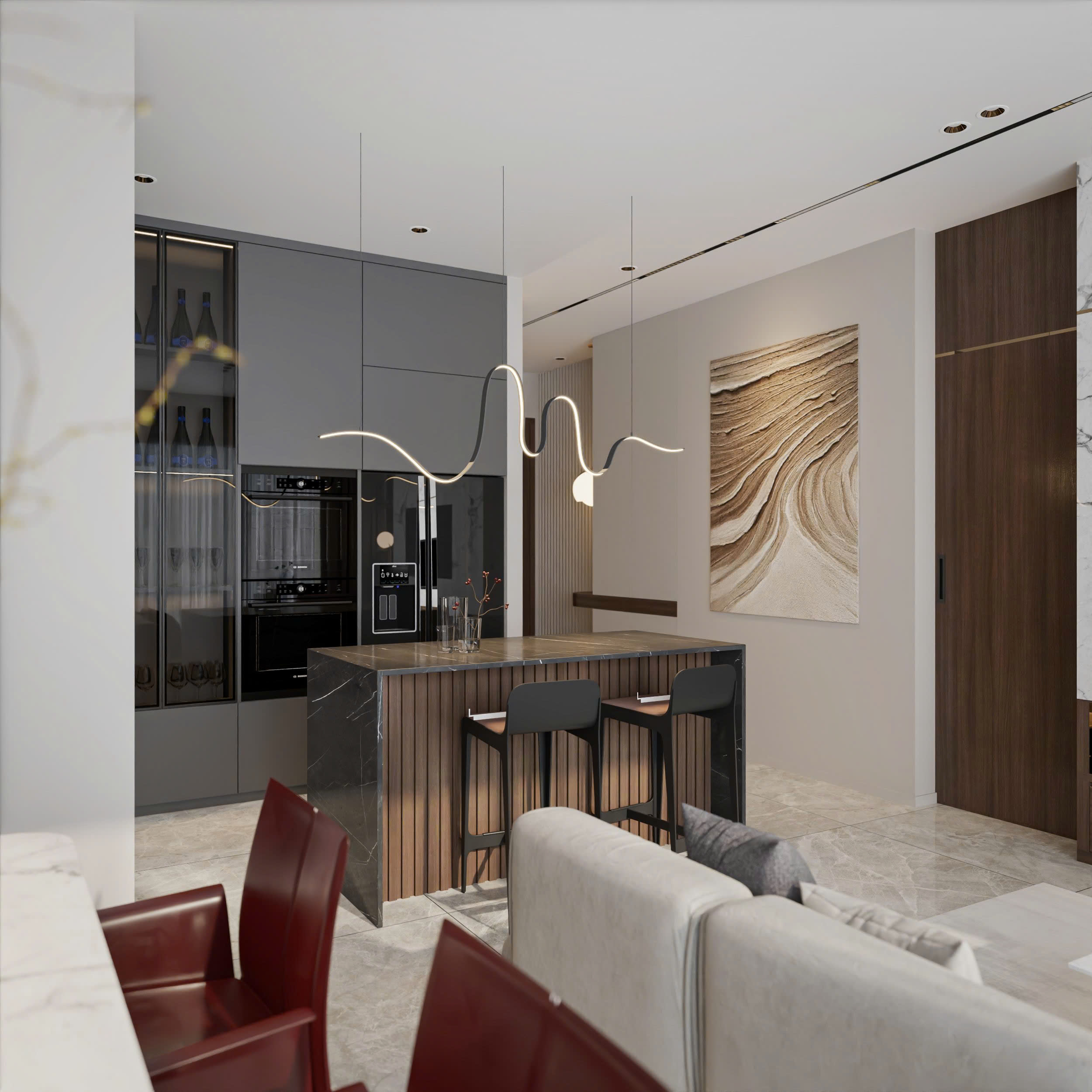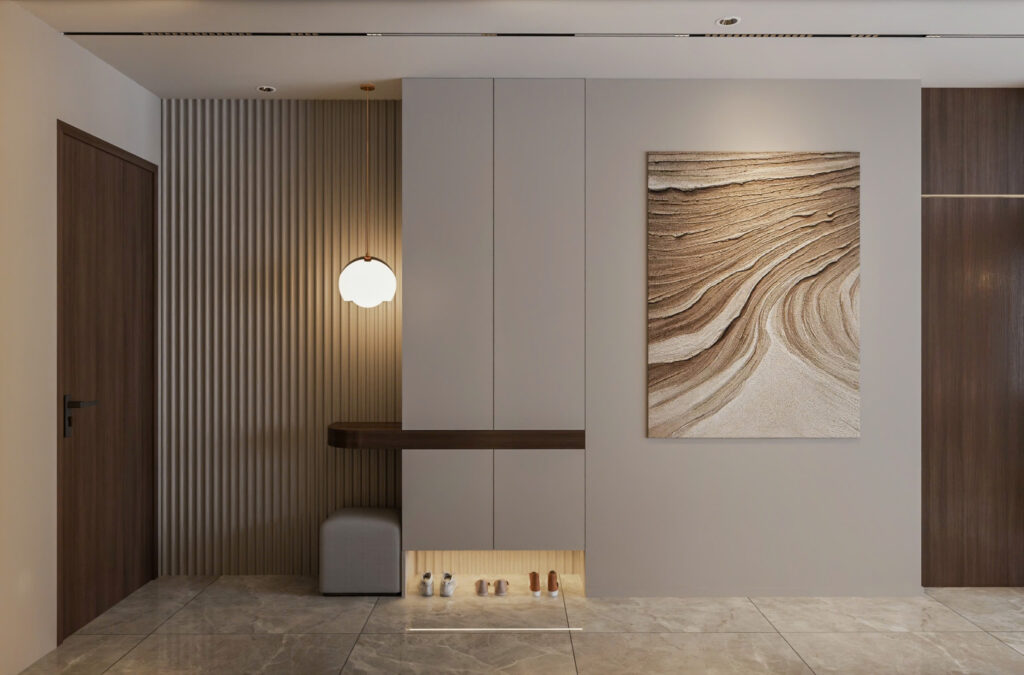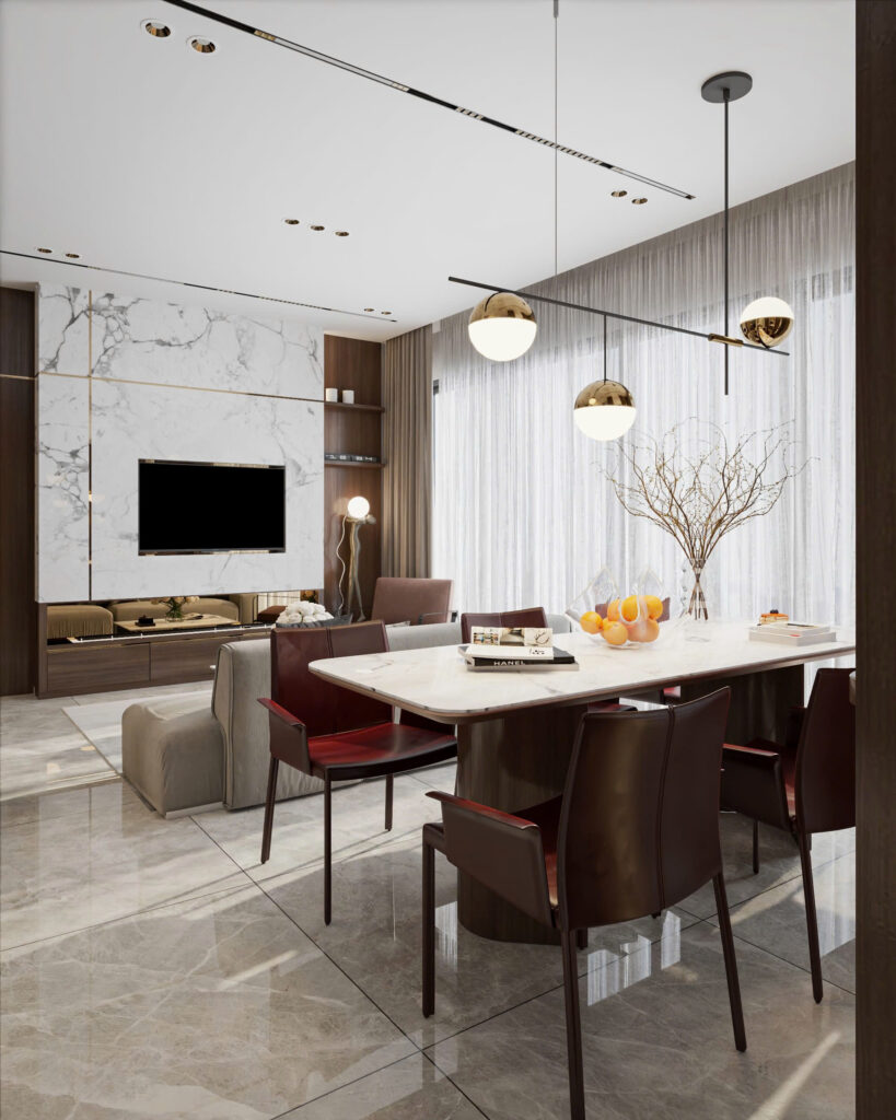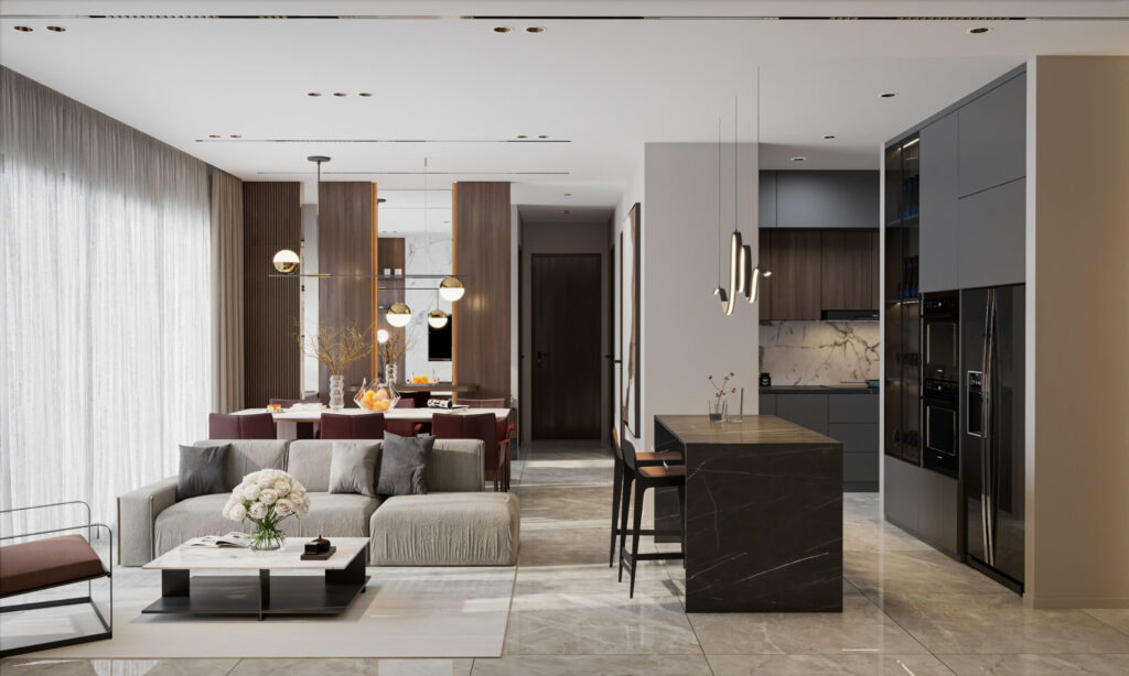 Bảng màu chủ đạo của căn hộ là sự kết hợp giữa các tông trung tính nền nã như xám đá, be sáng và trắng kem – làm nền cho các điểm nhấn nội thất đậm màu như nâu gỗ, đen nhám hay đỏ rượu. Sự đối lập có chủ đích này giúp tăng chiều sâu thị giác, đồng thời mang lại cảm giác sang trọng mà không cần phô trương. Các mảng tường đá marble trắng vân mây kết hợp với hệ gỗ veneer nâu sậm tạo nên lớp nền vật lý vừa thanh lịch vừa vững chãi.