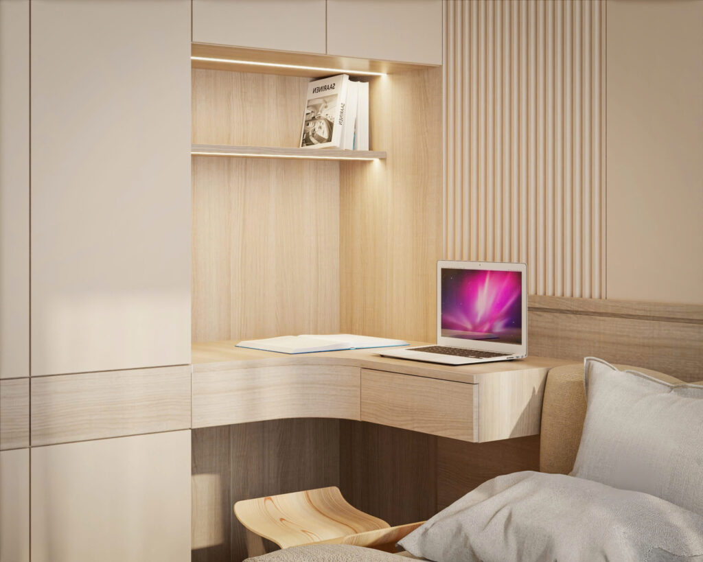 Mặt bằng căn hộ được Okko Studio tổ chức hợp lý để khai thác tối đa nguồn sáng tự nhiên. Khu vực sinh hoạt chung (phòng khách – bếp – ăn) được thiết kế theo layout mở, loại bỏ các vách ngăn cứng, tạo dòng chảy không gian liền mạch. Các phòng ngủ đều được bố trí tiếp xúc trực tiếp với cửa sổ lớn, mang lại sự thông thoáng. Riêng khu vực làm việc (office) sử dụng vách gỗ bán mở giúp vừa giữ được tính riêng tư, vừa không cản trở ánh sáng và tầm nhìn.