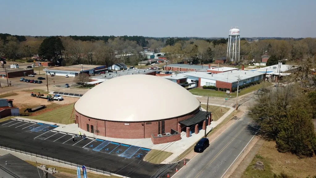 Nhà an toàn Louisville, Mississippi, là một ví dụ về nơi trú ẩn bão, lốc xoáy và động đất : https://monolithicdome.com/fema-design-and-construction-for-community-shelters-and-its-application-to-domes